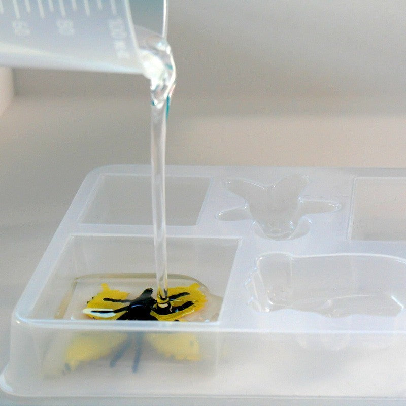 Această activitate de realizare independentă este perfectă pentru toți cei care doresc să păstreze amintiri minunate! Frunzele uscate, scoicile sau chiar animalele de plastic pot deveni accesorii superbe cu ajutorul acestui set de rășină. Copiii se vor bucura, de asemenea, de această activitate simplă pentru a crea diamante false, suporturi și alte decorațiuni pentru camera lor! După pregătirea bazei de rășină, copiii vor putea picta compoziția și o vor turna în diferite forme, înainte de a adăuga accesorii decorative. După 24 de ore, când se usucă, pot scoate frumoasele decorațiuni transparente din forme.