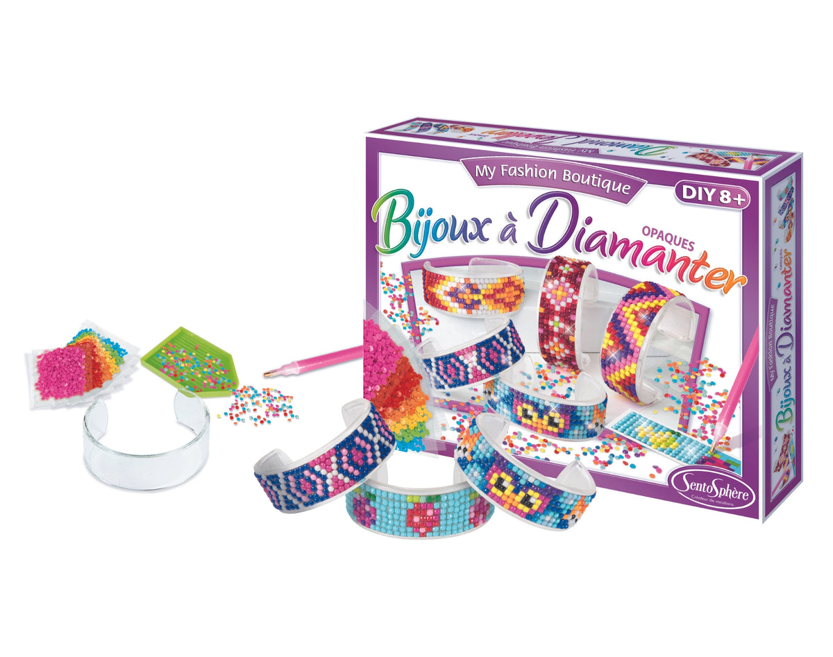 Creați 6 brățări cu modele geometrice și colorate! Sunt ușor de realizat și de purtat, fiind perfecte și pentru cadouri. Fiecare diamant pătrat opac este preluat cu ajutorul unui pix adeziv și plasat pe o pânză adezivă conform modelelor. Când ați terminat, adăugați un strat de lac deasupra pentru a fixa totul și atașați creația dumneavoastră minunată pe unul dintre cele 6 suporturi acrilice incluse. O activitate excelentă pentru tinerele pasionate de modă și mame!