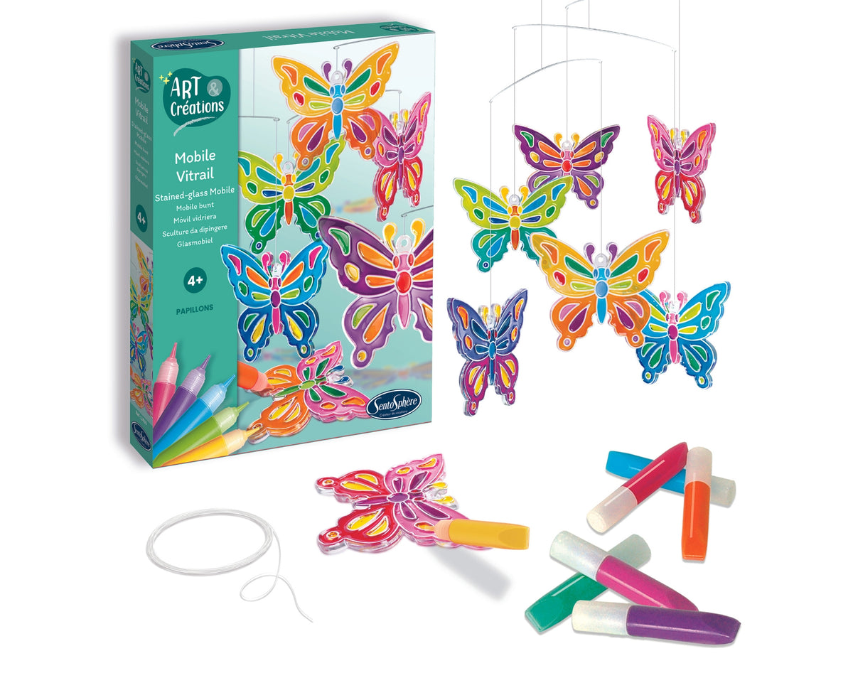 Datorită acestui set, copiii mici vor crea vitralii, injectând culorile alese în rame decorative. Câteva ore mai târziu, elementele vor fi uscate și cristaline, gata să fie agățate ca un mobil care se rotește și afișează mii de reflexii.