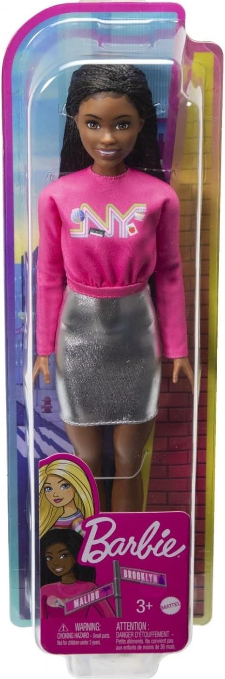 - Barbie® 'Brooklyn' Roberts păpușa arată exact ca personajul ei de pe ecran, purtând un tricou roz cu grafică NYC și o fustă metalică argintie la modă.