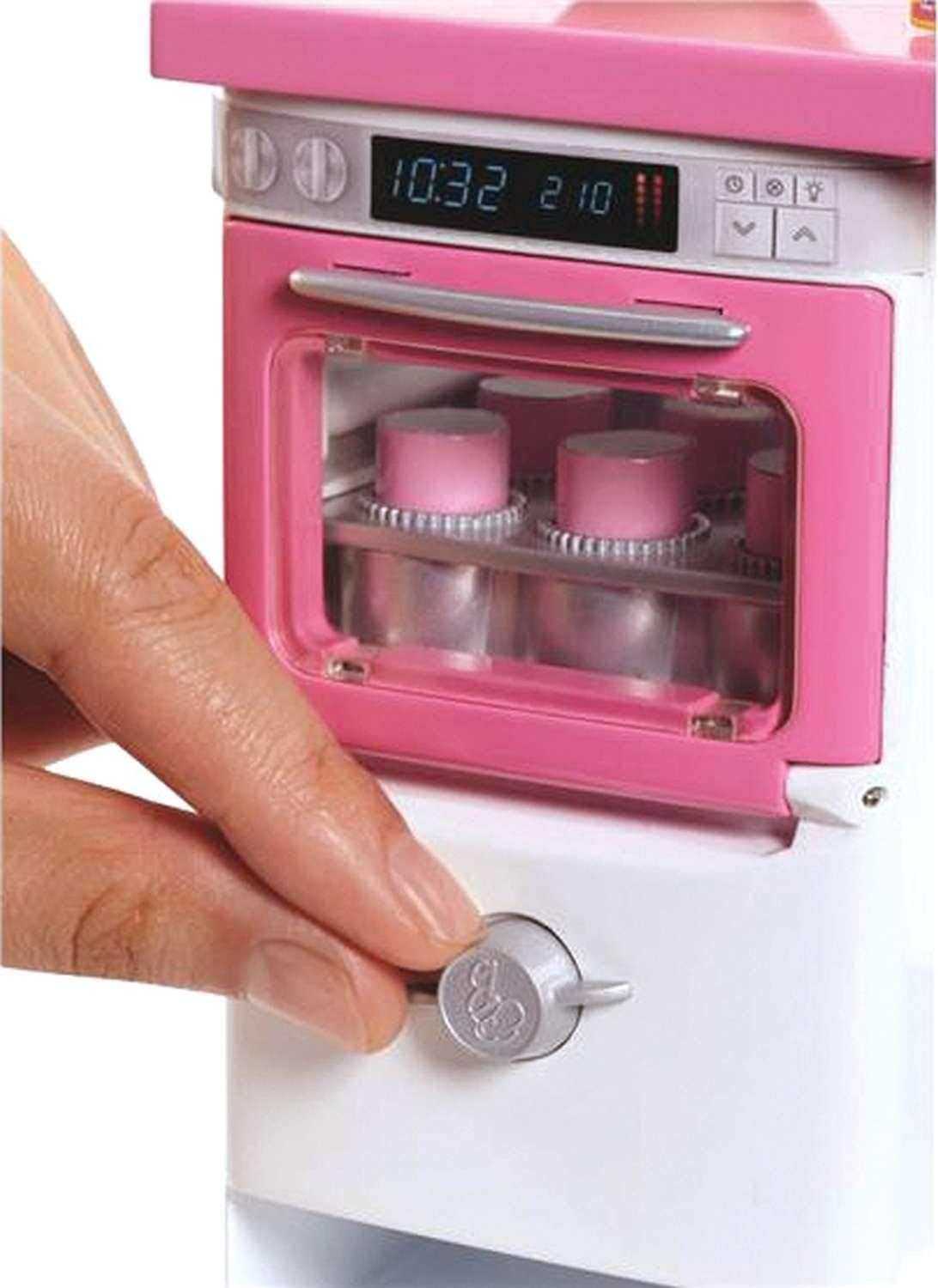 Bucurați-vă de distracție la gătit cu setul de joacă care include o păpușă Barbie® și un cuptor cu surprize magice – cronometrul sună, ușile funcționează, prăjitura pound cake și brioșele „cresc”, iar vârfurile brioșelor au glazură care își schimbă culoarea!