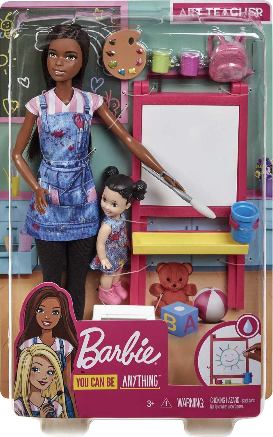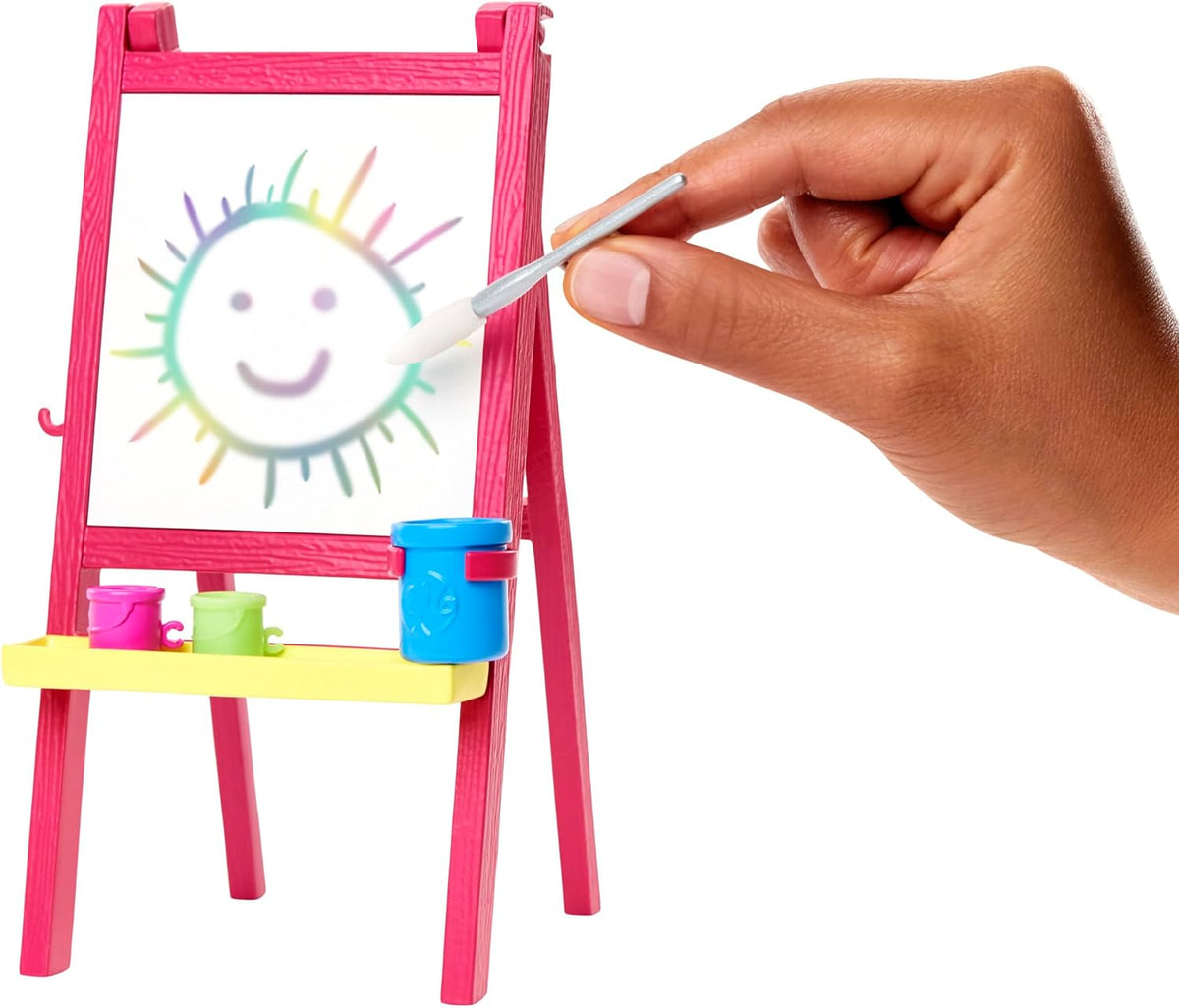 Preț pe unitate PentruBarbie, profesoara de artă, îi arată elevei sale cum să picteze pe un șevalet cu o surpriză pentru schimbarea culorilor: scufundă pensula (inclusă) în apă, pictează pe suprafața goală și imaginea apare magic! Creează iar și iar ștergând suprafața. Barbie este îmbrăcată în colanți, tricou, adidași și un șorț drăguț din denim, pregătită să-și învețe eleva curioasă, care poartă o rochiță adorabilă și un rucsac. Accesoriile de joacă includ un șevalet cu suprafață de pictură, recipiente pentru vopsea și apă, paletă, pensulă și un scaun pentru elevă.