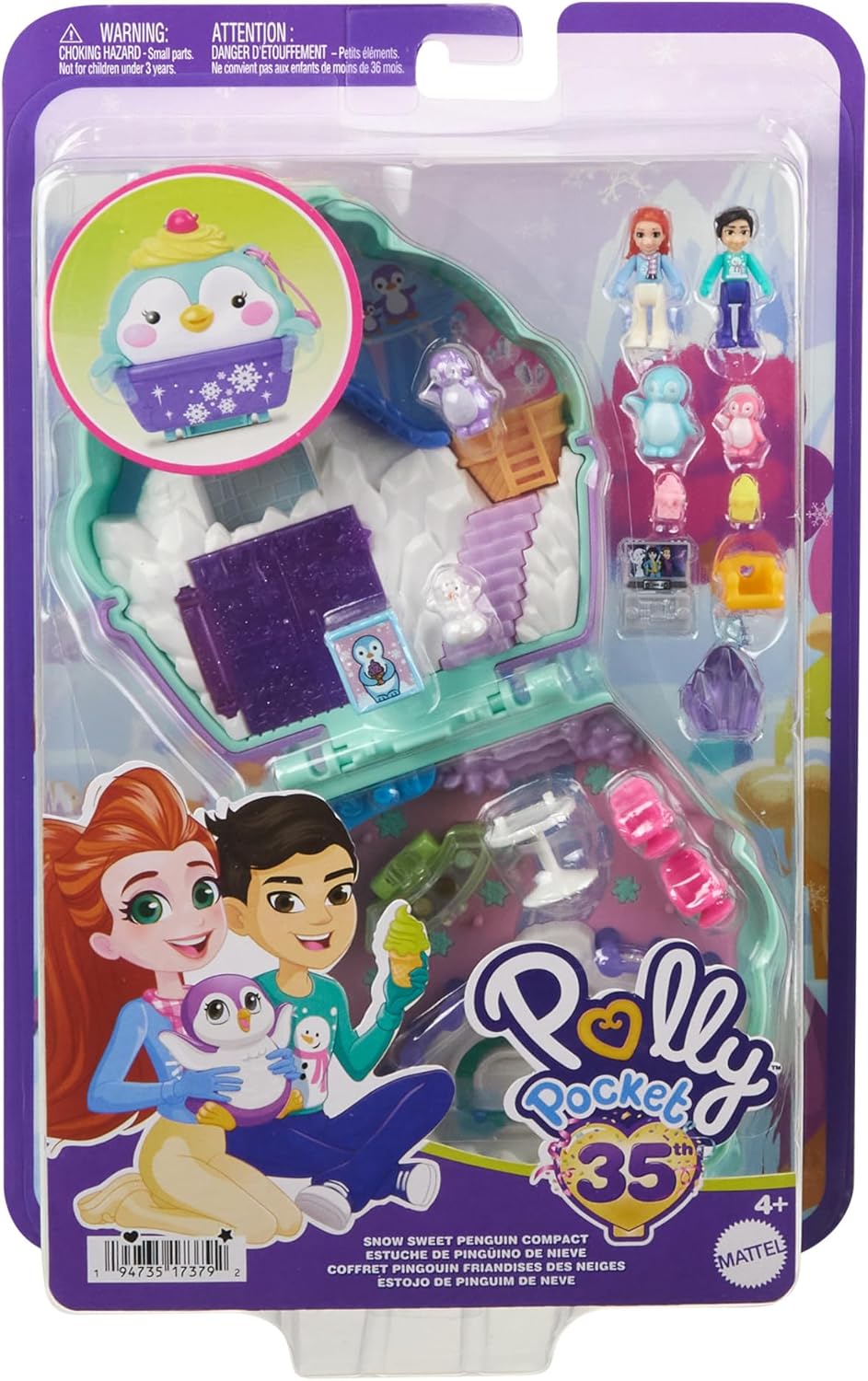 Ta Polly Pocket Snow Sweet Penguin Compact include două micro păpuși, 13 accesorii și 6 funcții pentru povestiri pentru cea mai bună aventură de iarnă!