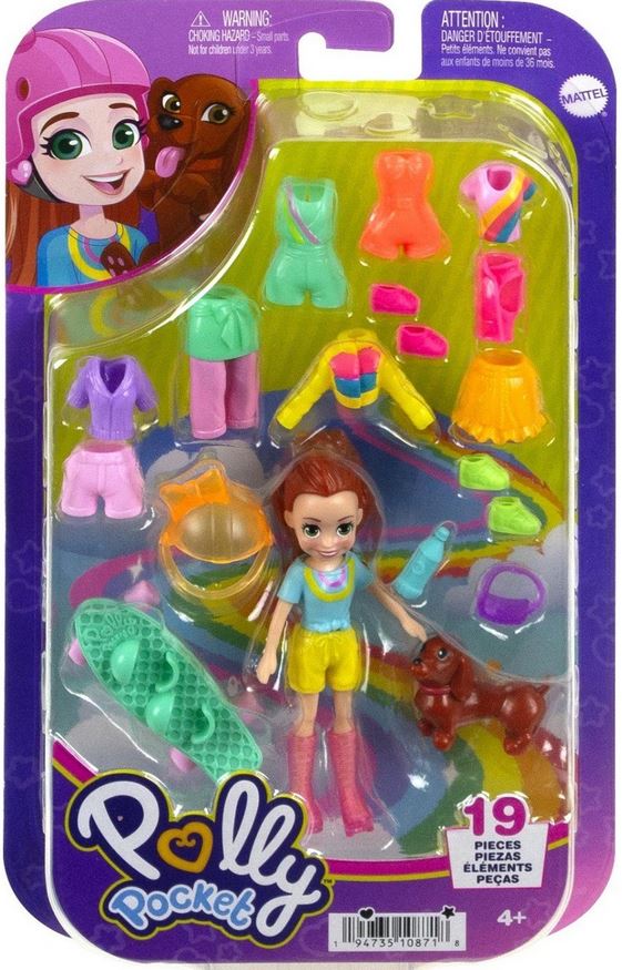 Mattel Polly Pocket - Păpușă cu set sportiv pentru skateboarding cu animal de companie (HKV90)
