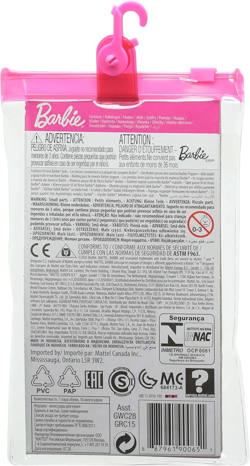 Include accesorii la modă, cum ar fitocuri înalte cu barete, torbico în formă de buze, perie de păr, șminkoinsticluță de parfum– tot ce are nevoie Barbie® pentru o seară de neuitat.