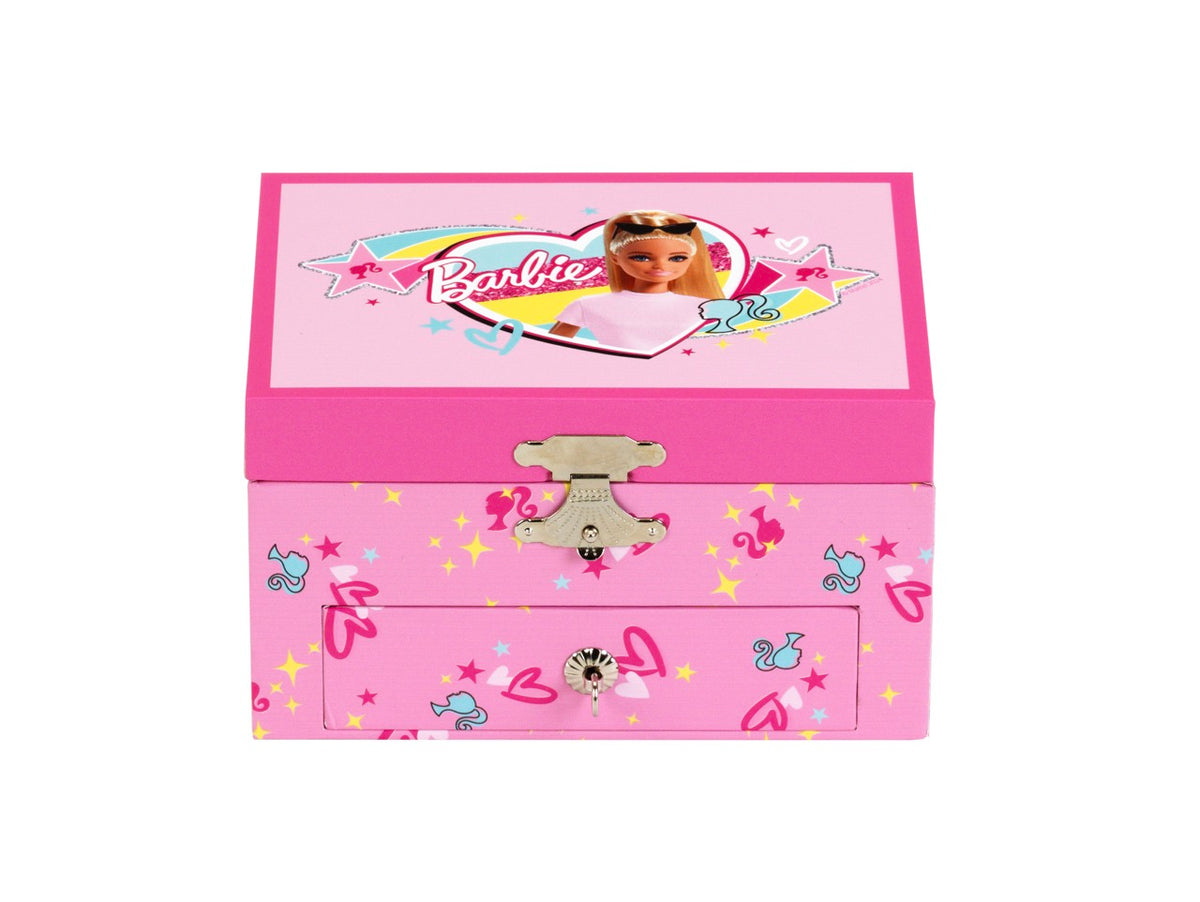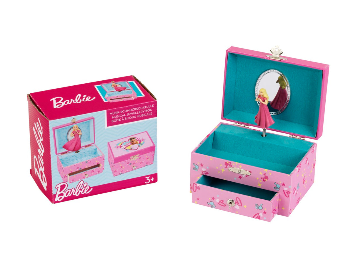 Fanaticii Barbie vor îndrăgi această cutie de bijuterii din prima clipă! Ridicați capacul frumos și mica balerină grațioasă Barbie se va învârti elegant în cerc și va dansa pe o melodie magică. Tot ce trebuie să facă tinerele admiratoare ale păpușilor este să întoarcă cutia muzicală mecanică cu cheia aurie. În fața lor se deschide o lume de vis, care are și multe aspecte practice. Bijuteriile Barbie, pantofii, oglinzile, perii de păr și pieptenii – toate acestea și multe altele pot fi păstrate de părinții Barbie în cutie. Și de fiecare dată când scot ceva din ea, muzica delicată îi poartă într-o lume imaginară și minunată Barbie.