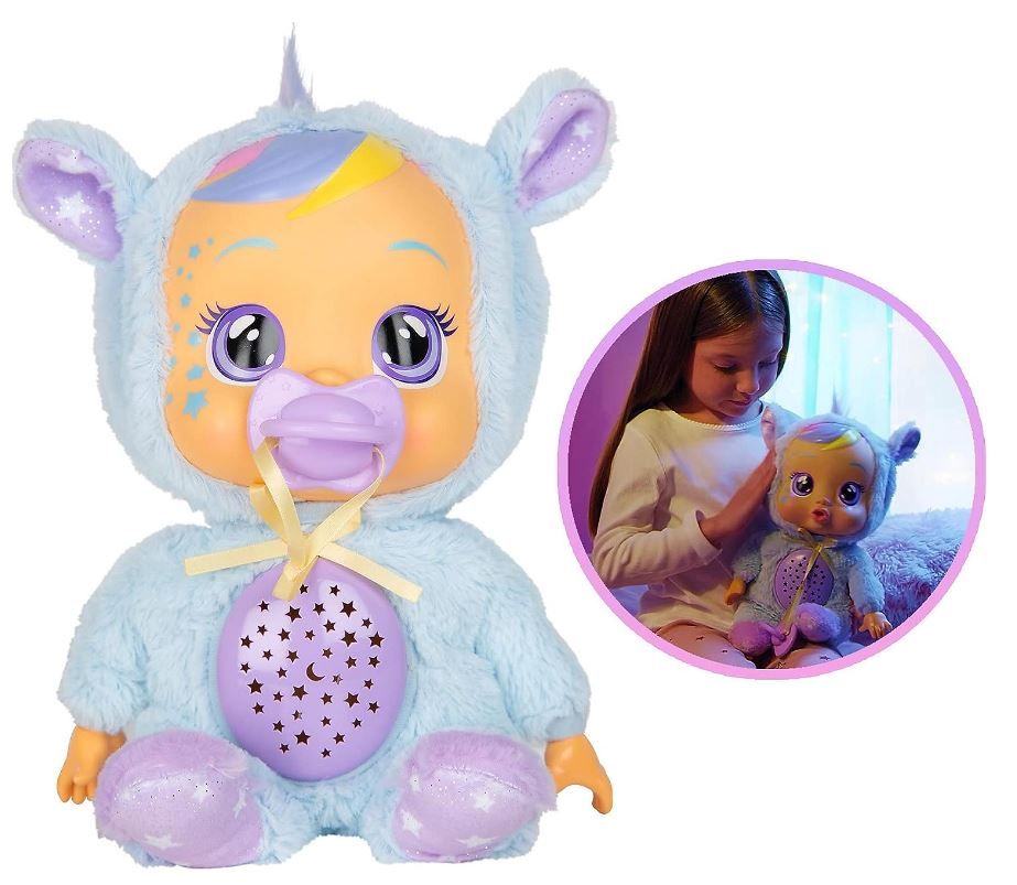 Cry Baby Goodnight Starry Sky Jenna are funcții speciale care fac timpul de culcare liniștitor și magic. Când îi iei suzeta, începe să plângă cu lumini care strălucesc și emite sunete realiste de bebeluș. Dacă îi dai înapoi suzeta, încetează să plângă. Apăsându-i burtica moale se activează o proiecție a cerului înstelat, care arată stelele și luna în orice încăpere. În plus, redă peste 10 minute de cântece de leagăn liniștitoare, care creează o atmosferă relaxantă pentru somn.