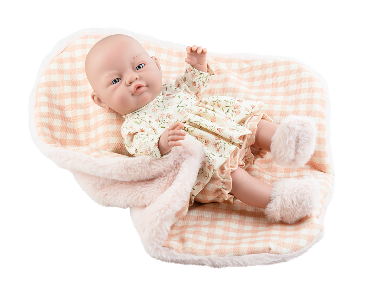 - Materialul din care este făcut are o atingere mai moale și un miros care amintește mai mult de un bebeluș. Este îmbrăcată într-o rochie cu flori și pantalonași pufoși. Este inclusă și păturica ei în carouri și pufoasă.