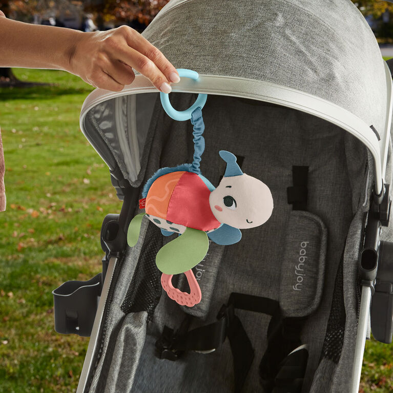Inspirat de animalele promovate de Fondul Mondial pentru Natură, jucăria de pluș Fisher-Price Planet Friends Sea Me Bounce Turtle pentru cărucioare este fabricată dintr-un material care conține 80% plastic reciclat și este ambalată în ambalaje certificate FSC, susținând gestionarea responsabilă a pădurilor. Jucăria include diverse elemente tactile și vizuale pentru o joacă senzorială atractivă, precum și un mâner de tras și eliberat care activează sunete amuzante de clopoțel și sărituri. Mânerul servește și ca inel de dentiție fără BPA, în formă de scoică. Jucăria se atașează ușor de copertina căruciorului, de salteaua de joacă pentru bebeluși sau de geanta pentru scutece, pentru utilizare în timpul călătoriilor.
