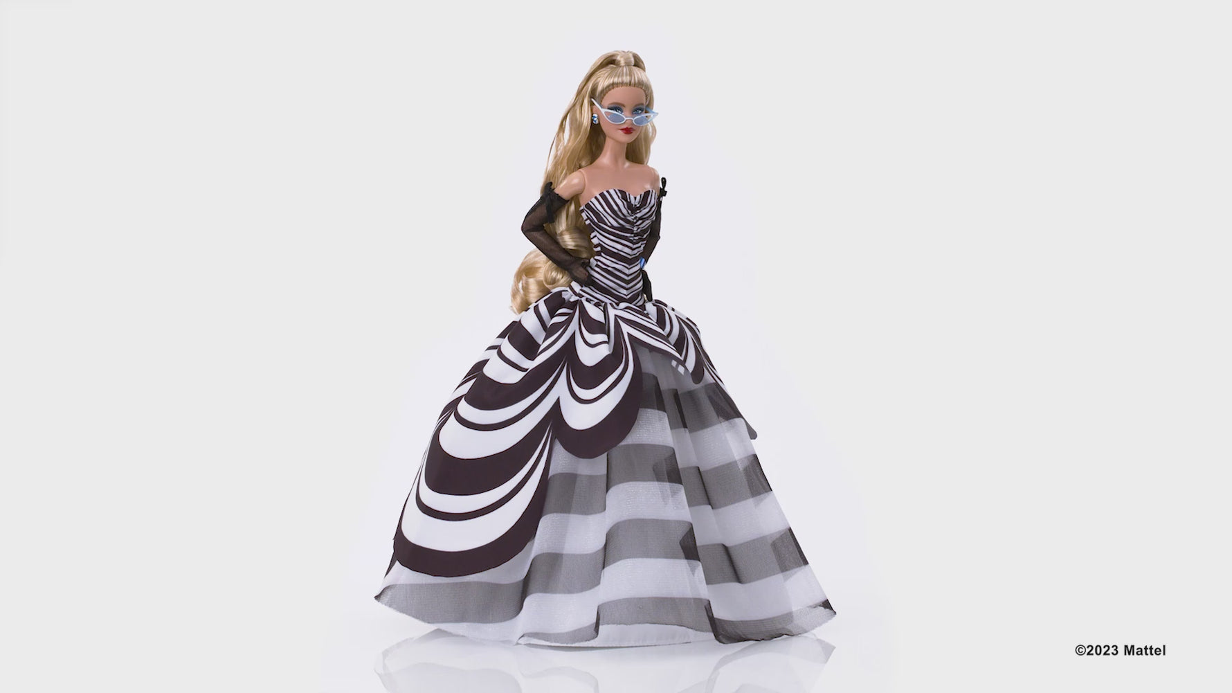 - Barbie sărbătorește cea de-a 65-a aniversare cu o păpușă colecționabilă frumoasă, care reinterpretează într-un mod modern elementele clasice ale păpușii Barbie originale. Ea poartă o rochie alb-negru, inspirată de costumul de baie purtat de prima păpușă Barbie.