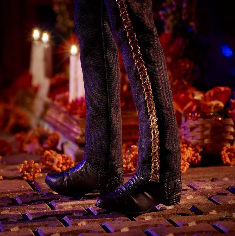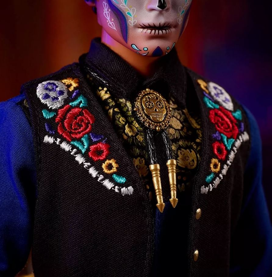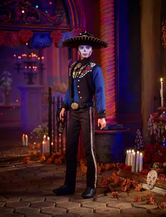 Păpușa este perfectă pentru colecționari și ideală ca cadou. Se remarcă printr-o atenție deosebită la detalii. Păpușa Ken în stil Charro poartă o cămașă albastră și un veston, decorate cu cranii strălucitoare și accesorii florale. Ținuta sa este completată minunat de o cravată cu motiv de craniu și un sombrero cu panglică aurie. Ambalajul este potrivit pentru expunere.
