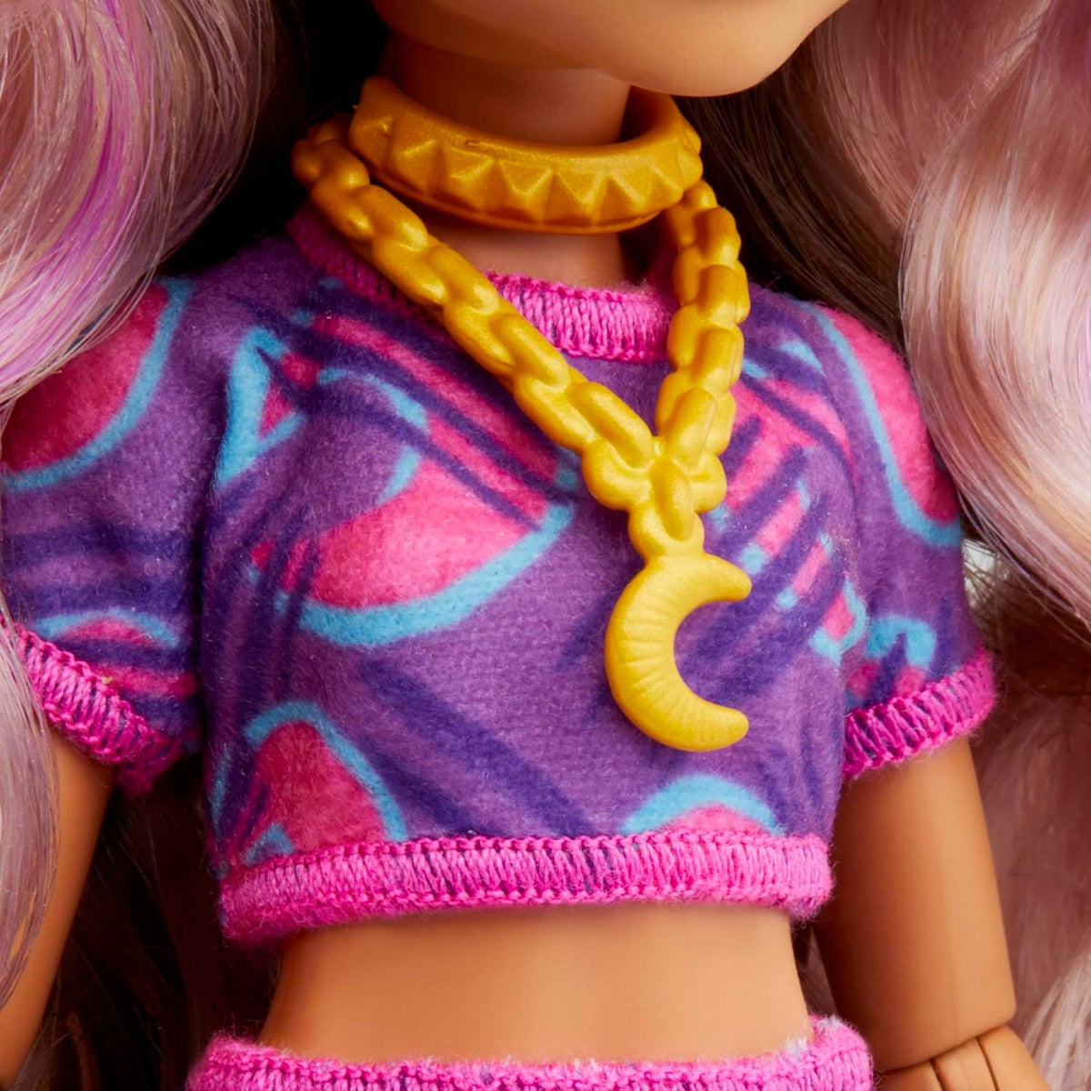 Clawdeen Wolf arată uimitor în fusta violet și topul cu motiv de lună și gheare. Gulerul stratificat și pantofii din piele ecologică completează aspectul ei extrem de înfricoșător.