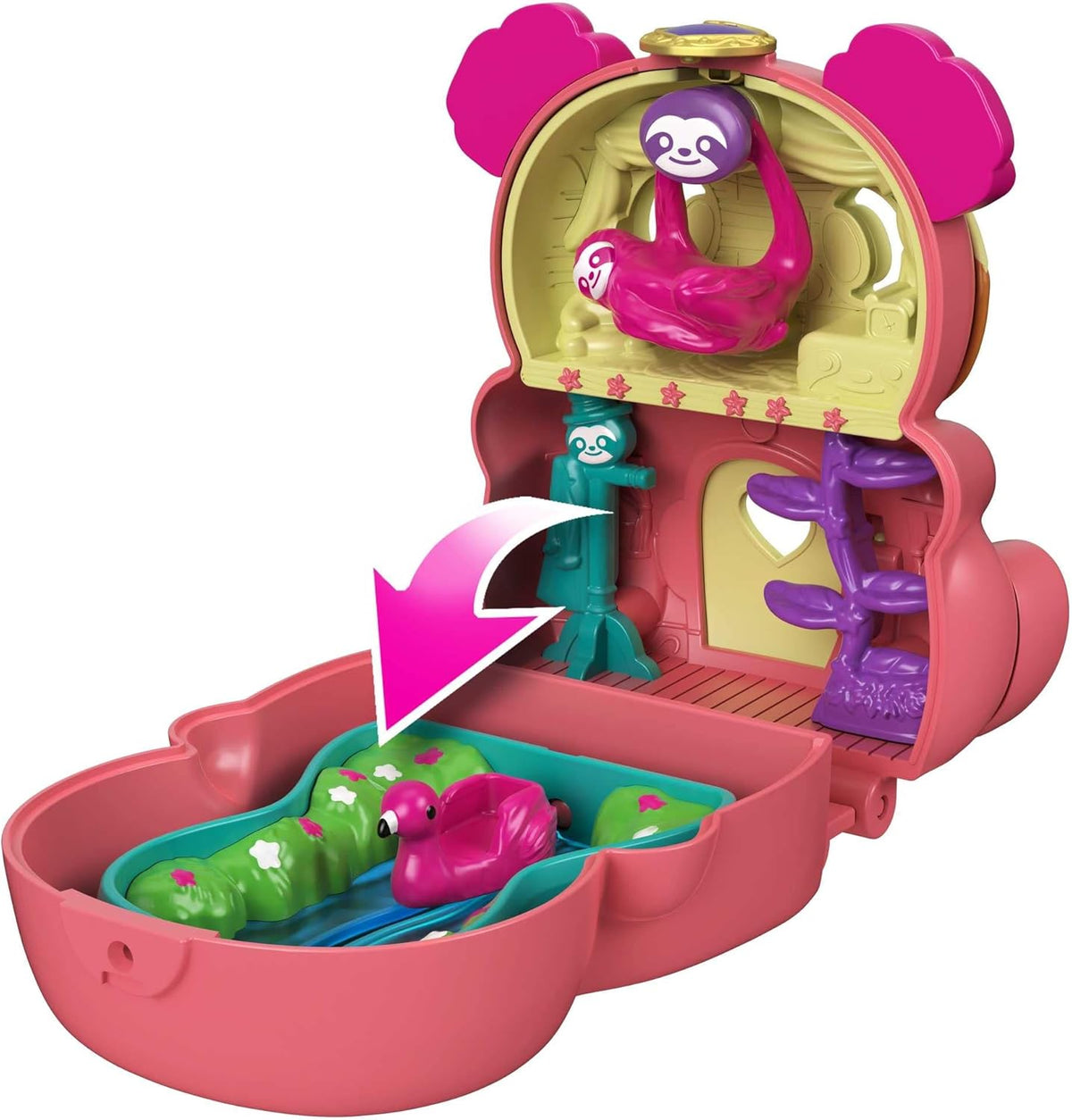 - Pentru o suprafață de joacă suplimentară, întoarceți baza compactului pentru și mai multe opțiuni de joacă! Compactul include o micro-păpușă cu 5 articulații mobile pentru poziționare și joacă; o figurina de leneș; și funcții distractive de descoperit: leagăn pentru leneș, flamingo care alunecă pe iaz și multe altele!