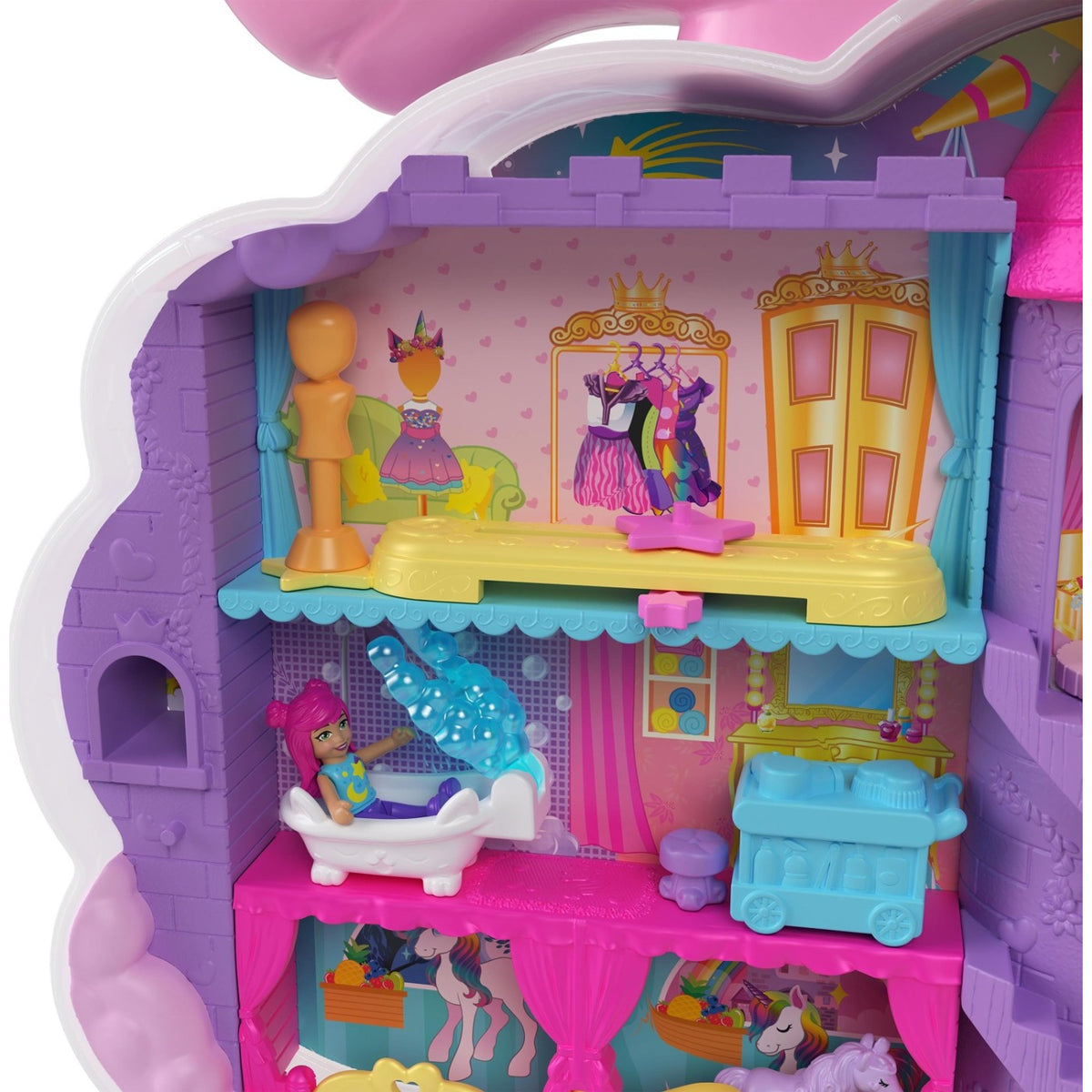 - Polly Pocket™ Salonul Unicorn Curcubeu oferă o joacă 2-în-1 cu o cap de stilist pe exterior și un set de joacă cu 3 etaje în interior!