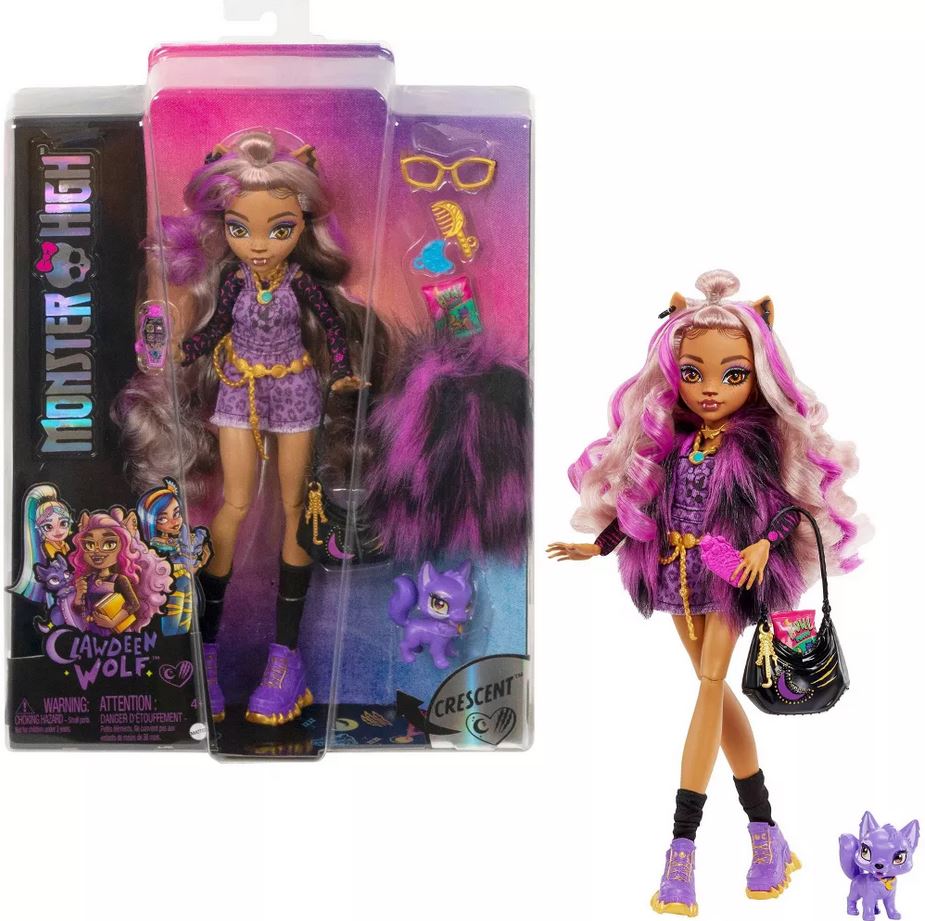 - Școala a început, iar spiritele Monster High™ apar într-un stil scream-tastic!Lutka Clawdeen Wolf™ se plimbă pe coridoarele Monster High™ în stilul său clawsome, care include o rochie cu imprimeu animal și un tricou lung cu imprimeu de lună.